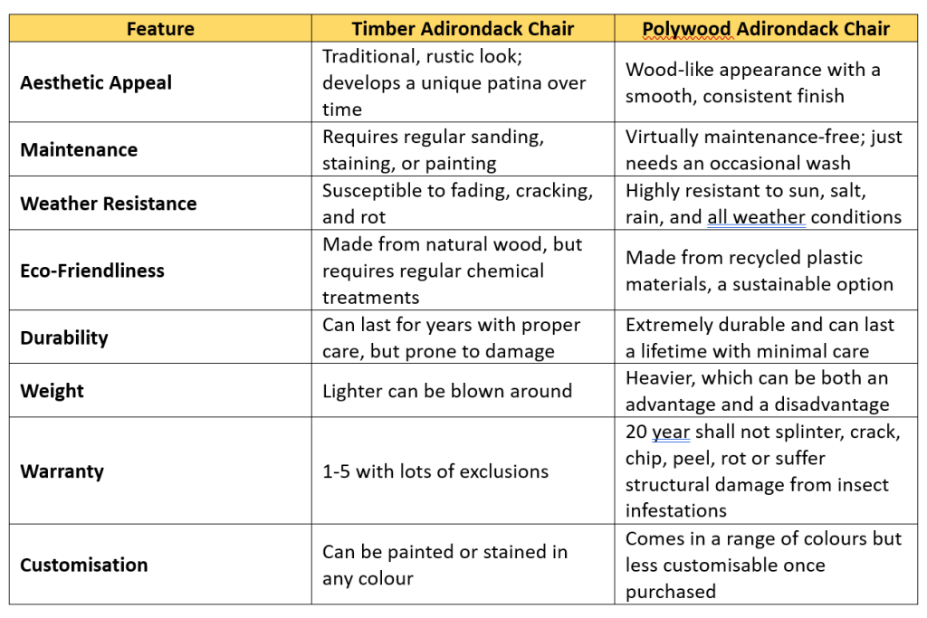 Let’s break down the key differences between Polywood and timber Adirondack chairs: